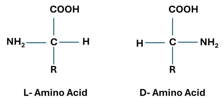L-configuration amino acids correspond structurally to L-glyceraldehyde. The chirality plays a critical role in enzymatic specificity and protein conformation.