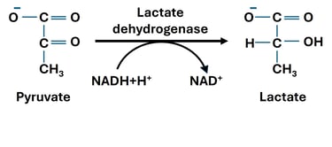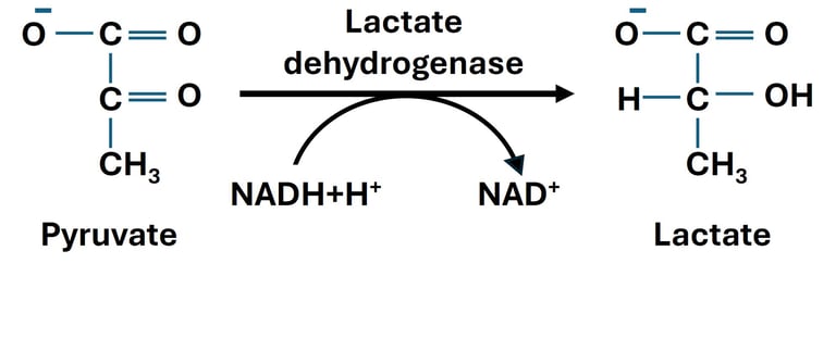When oxygen supply is limited or cellular demand for ATP exceeds the capacity of oxidative phosphorylation, cells switch to anaerobic metabolism. In this state, pyruvate—the end product of glycolysis—undergoes reduction to lactate, catalyzed by the enzyme lactate dehydrogenase (LDH).