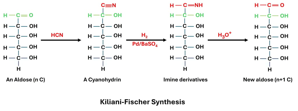 Kiliani–Fischer Synthesis – Step-up reaction lengthening aldose chain by one carbon.