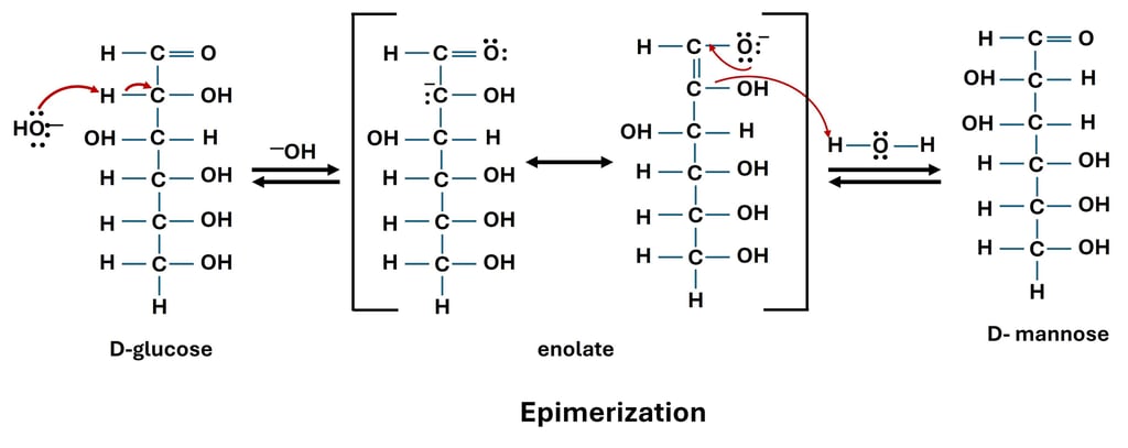 Under alkaline conditions, epimerization can be accomplished in the lab, frequently with the use of an enediol intermediate. An enolate that reorganizes into an enediol is created when the base eliminates the α-hydrogen next to the carbonyl carbon. Depending on whether face of the double bond is protonated, this enediol can either regenerate the original sugar or form its epimer when it is reprotonated. For instance, a combination of D-glucose, D-mannose (C2 epimer), and D-fructose is produced when D-glucose is treated with diluted alkali.