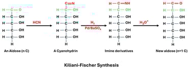 In carbohydrate chemistry, the Kiliani–Fischer synthesis is a traditional reaction that enables aldose sugars to undergo step-up extension by one carbon atom. It was created by Emil Fischer and Hermann Kiliani and was an essential technique for examining and contrasting the structures of monosaccharides. Because it allows scientists to transform a known aldose into its higher homolog and discover structural links amongst sugars, this reaction is especially significant.