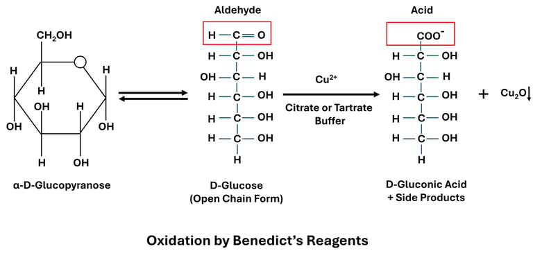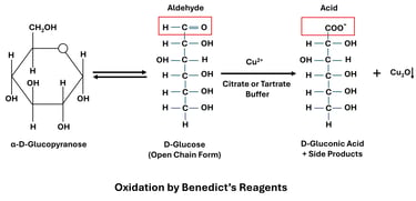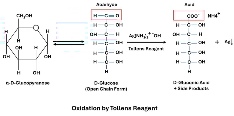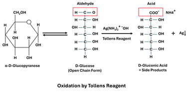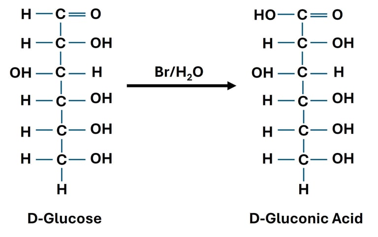 Oxidation Reactions – Convert aldehyde groups to acids (e.g., Benedict’s, Tollen’s, Bromine water tests).