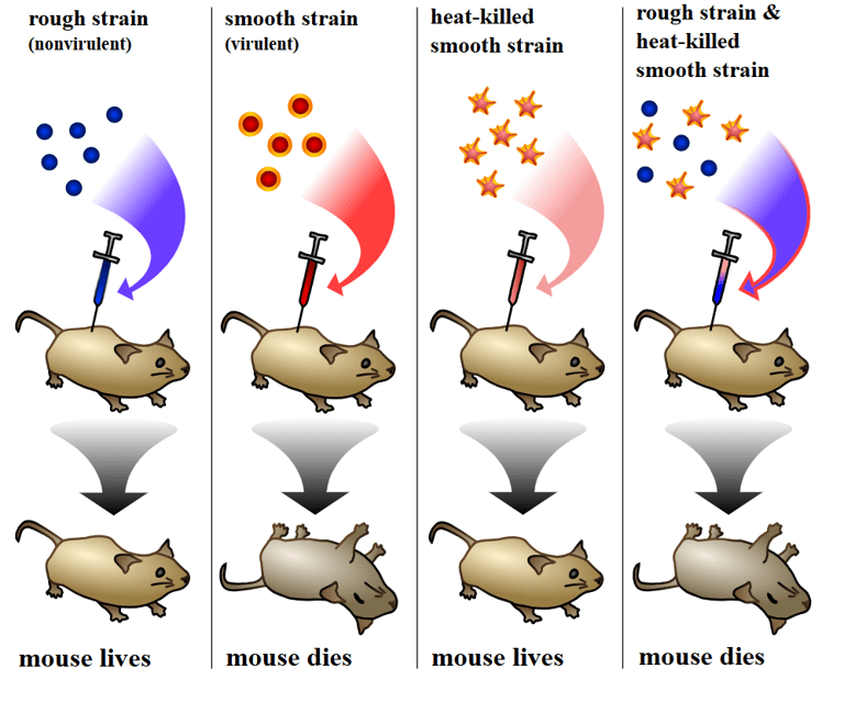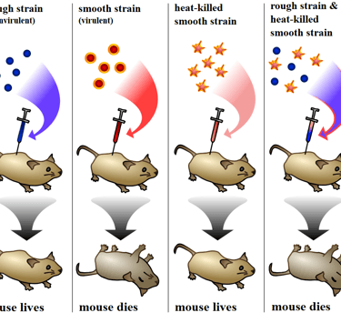 Griffith's experiment discovering the "transforming principle" in Streptococcus pneumoniae (pneumococcal) bacteria.