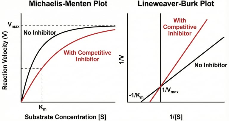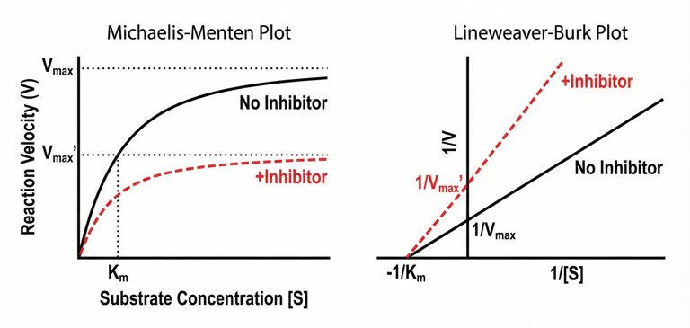 Learn enzyme inhibition in an easy yet detailed way. Understand competitive, non-competitive, and uncompetitive inhibition, with clear explanations of Vmax, Km, kinetic graphs, and real-world biochemical relevance.