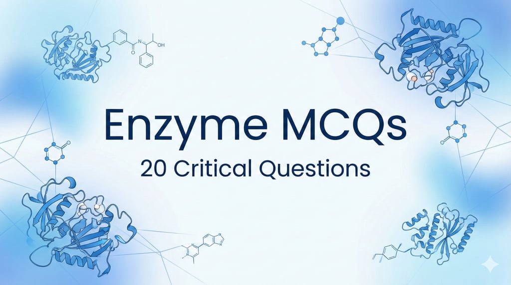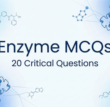 Test your biochemistry knowledge with this interactive Enzyme MCQ quiz. Includes 20 critical questions on kinetics, inhibition, and enzyme mechanisms with answers.