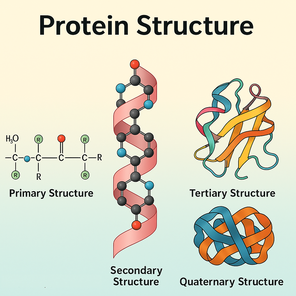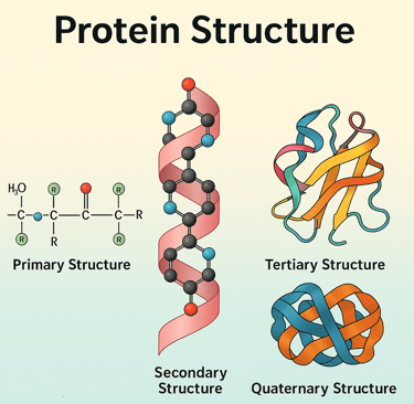 Explore the complete hierarchy of protein structure — from primary amino acid sequence to complex tertiary and quaternary folding. Learn about peptide bonds, alpha helices, beta sheets, motifs, domains, and how structure determines function in biology.